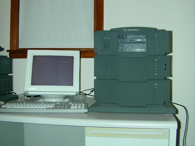 Pictures of a Motorola 900 modular chassis, with a 33MHz MVME187 CPU board, 32MB RAM, 4 MVME332XT serial boards, and an Archive 250MB QIC tape drive.
