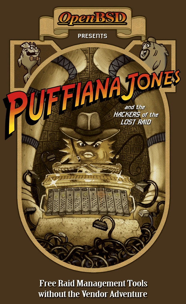 The back features a Frazetta-style painting by Ty Semaka for the "Puffy the Barbarian" theme of the OpenBSD 3.3 release. The front contains a modified quote from the Conan the Barbarian movies.