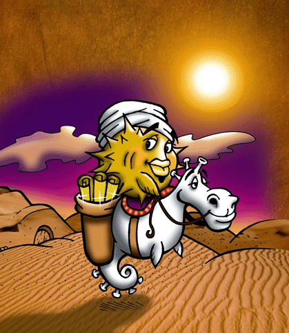 A T-shirt showing Puffy Babba with a bag of documentation heading out over the desert on his sea horse.